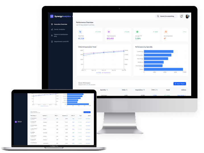 Consolidate engagement metrics for all doctors on Synergy’s “Find a Specialist” portal and track keyword performance-including CTR, clicks, and impressions-to assess digital visibility. Generate individualized reports providing key insights and actionable recommendations for doctors, while enabling leadership to monitor doctor-wise performance through interactive visual dashboards. The system ensures scalable data storage and efficient querying to support continuous analytics and decision-making.